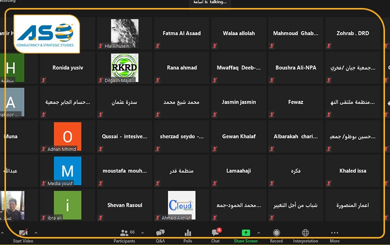 وًعقِدت الجلسة الّتي يسّرها الناشط المدني، أسامة أحمد، عبر تطبيق ZOOM، وشارك فيها ممثّلون عن منصّة الحلول الدائمة DSP، ومؤسسة إيماب البحثيّة ومنصّة أصوات المهجّرين السوريين، ومنظّمة المساعدات الشعبيّة النرويجية الدّاعمة لمنصّة مؤسّسات المجتمع المدني في شمال وشرقي سوريا.